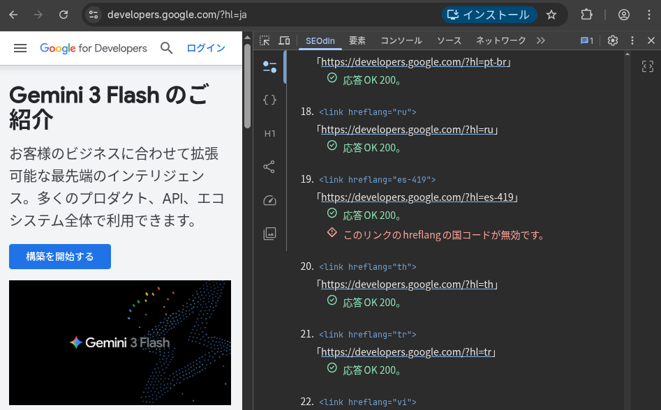 …ん?おや? https://developers.google.com/?hl=es-419 はステータスコード「200 OK」を返していますが、「このリンクのhreflang国コードは無効です」と表示されているではありませんか。